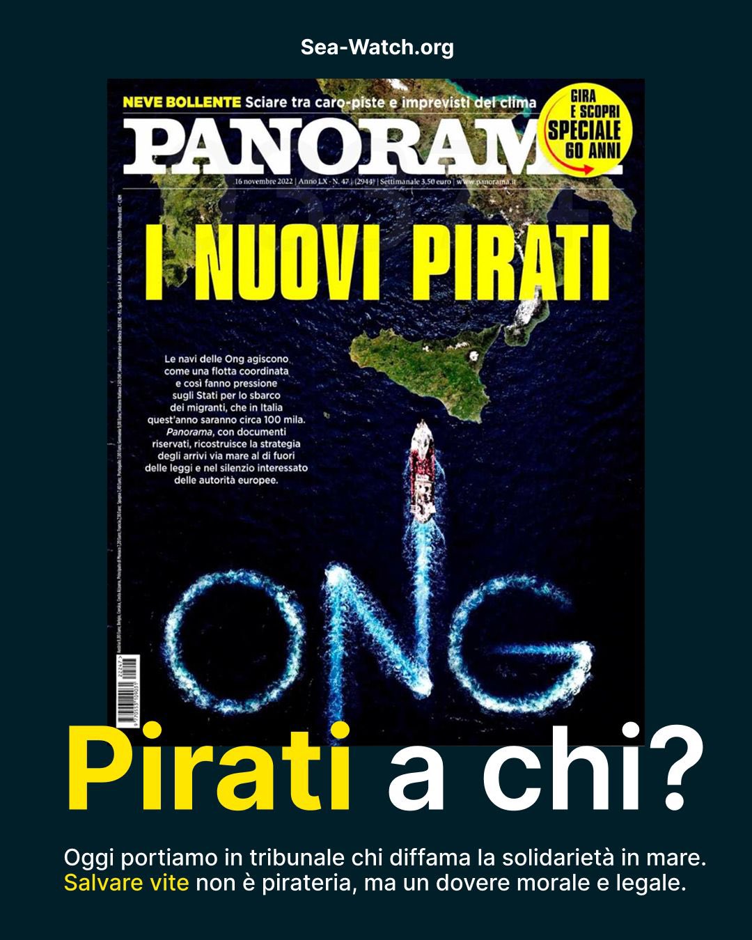 A Milano ha inizio il processo per diffamazione contro questa copertina di #Panorama, a seguito della denuncia di #SeaWatch insieme a @openarms_it, @AOIcooperazione, e @emergency_ong (Continua..🧵)