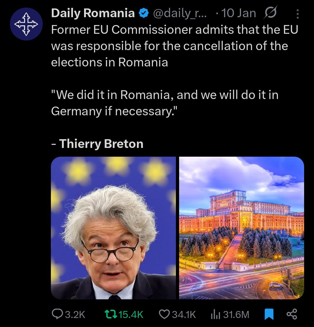 Ma se non bastasse, Breton è lo stesso che ha minacciato di annullare le elezioni in Germania, come “abbiamo fatto in Romania”, se per colpa di X i tedeschi avessero votato Afd.