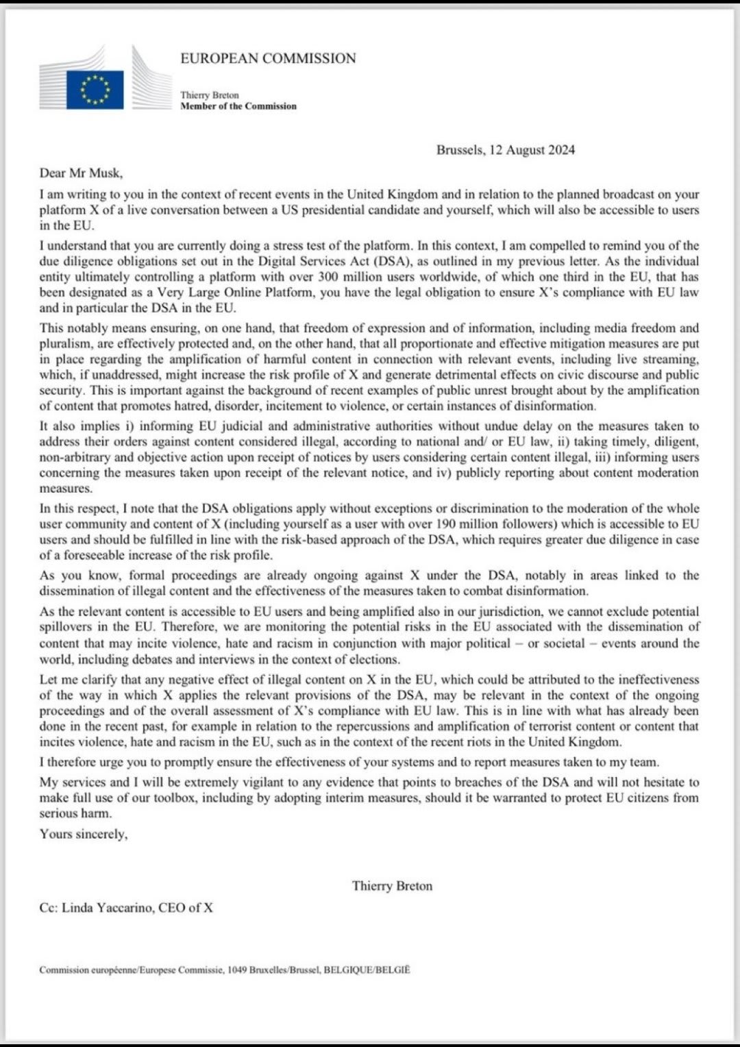 Quella che segue è la lettera inviata da Breton a Elon Musk nell’agosto 2024, poco prima delle elezioni che hanno riportato al potere Donald Trump.